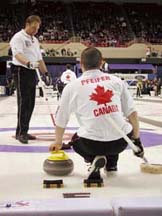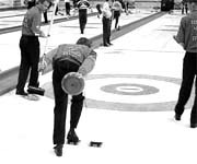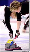 A játékosok néhány méteren át jellegzetes testhelyzetben együtt csúsznak a gránittal, még mindig fogva azt. Amelyik kezükben tartják a követ, azzal a lábukkal tolták el magukat a hack-től, s így csúszás közben ezt a lábukat hátranyújtják az indulás eredményeként, és nem utolsó sorban egy kényelmesebb testhelyzet érdekében. Másik lábukat könnyedén maguk alá húzzák, hogy megmaradjon a jégen kialakult kényes egyensúly: ezt arra az oldalra kinyújtott söprű is nagyban segíti. A követ a hog line előtt kell elengedni, különben érvénytelenné válik a dobás. Ez a vonal a hack-től kb. 10 méterre van. Amint a követ elengedik, már semmilyen módon nem lehet hozzáérni, csak új end kezdésekor. A hog line-nál két játékos várja, akik azután a dobó hangos utasításait követve sűrű söpréssel irányítják a kő útját. Bár nem vagyok az animált gif híve, ez a puritán képsor hűen mutatja be a fontosabb mozdulatokat: 3. Söprés Két dolgot hajt végre: