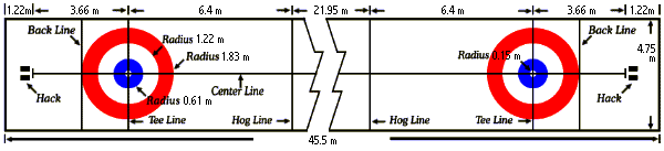 Nagyon pontosnak tűnő, közel sem kerek számokkal meghatározott adatokat láthasz a képen, melyek egy szabályos pálya különböző alakzatainak méretére vonatkoznak. A méterben megadott adatok szigorúan betartandók mindenféle nemzetközi curlingversenyen, centiméteres pontossággal. Akkor miért nincsenek a számok leegyszerüsítve, kérdezhetné az érdeklődő. Ennek oka kézenfekvő: a hagyományossá vált, másfélszáz éve letett szabályok láb (foot) mértékegységben írattak meg, ami ma is használatos az angolszász országokban, ellenben az európai kontinenssel, és persze velünk. A könnyebb érthetőség kedvéért számoltam át méterre. Sajnos elveszítették kerekségüket.